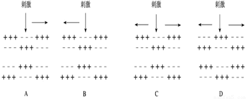 在一條離體神經(jīng)纖維的中段施加電刺激,使其興奮。下圖表示刺激時的膜內(nèi)外電位變化和所產(chǎn)生的神經(jīng)沖動傳導(dǎo)方向(橫向箭頭),其中正確的是(。