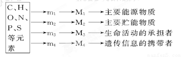 下圖是生物體內(nèi)幾種有機(jī)物組成以及它們各自功能的關(guān)系圖,m1、m2、m3、m4分別是大分子物質(zhì)M1、M2、M3、M4的組成單位。下列說(shuō)法正確的是 ( )
