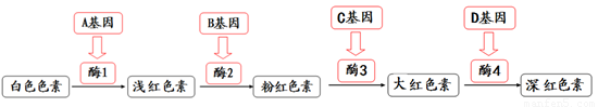 一種植物的花色有白色、淺紅色、粉紅色、大紅色和深紅色五種,控制相關(guān)色素的酶的合成如下圖所示。若兩株深紅色的植株雜交,子代中花色為深紅色的植株占81/256,則相關(guān)的敘述不正確的是( )