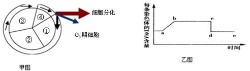 下圖圖甲為細(xì)胞周期示意圖,其中①、②、③代表間期連續(xù)的三個(gè)時(shí)期,④代表分裂期;G0期細(xì)胞表示分裂結(jié)束后細(xì)胞的去路之一,即細(xì)胞暫時(shí)不分裂,但在一定條件下可恢復(fù)分裂能力。下圖圖乙為細(xì)胞分裂過(guò)程中每條染色體上DNA變化規(guī)律曲線。下列敘述正確的是