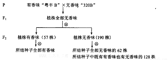 (8分)水稻有香味是受基因控制的,其植株和種子均有香味。研究人員為確定香味基因的顯隱性,以有香味的“粵豐B"和無香味“320B”水稻為材料,互為父母本進(jìn)行如下雜交實(shí)驗(yàn):請分析回答: