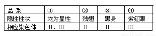 現(xiàn)有①~④四個果蠅品系(都是純種),其中品系①的性狀均為顯性,品系②~④均只有一種性狀是隱性,其他性狀均為顯性。這四個品系的隱性性狀及控制該隱性性狀的基因所在的染色體如上表所示:若需驗證基因的自由組合定律,可選擇下列哪種交配類型