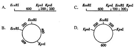 現(xiàn)有一長(zhǎng)度為1000堿基對(duì)(bp)的DNA分子,用限制性核酸內(nèi)切酶EcoRI酶切后得到的DNA分子仍是1000bp,用Kpnl單獨(dú)酶切得到400bp和600bp兩種長(zhǎng)度的DNA分子。用EcoRI、Kpnl同時(shí)酶切后到200bp和600bp兩種長(zhǎng)度的DNA分子。該DNA分子的酶切圖譜正確的是 ![]()