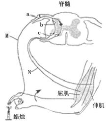 (8分)人手指意外觸到蠟燭火焰,引起屈肘反射。其反射弧示意圖如下圖。