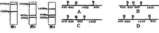 現(xiàn)有一長(zhǎng)度為3000堿基對(duì)(bp)的線性DNA分子,用限制性核酸內(nèi)切酶酶切后,進(jìn)行凝膠電泳,使降解產(chǎn)物分開(kāi)。用酶H單獨(dú)酶切,結(jié)果如圖1。用酶B單獨(dú)酶切,結(jié)果如圖2。用酶H和酶B同時(shí)酶切,結(jié)果如圖3。該DNA分子的結(jié)構(gòu)及其酶切圖譜是 ![]()