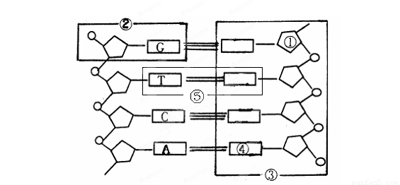 下圖是DNA分子的結(jié)構(gòu)模式圖,請用文字寫出①—⑤的名稱。(5分)