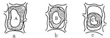 假設(shè)將標(biāo)號為A、B、C的同一個植物細(xì)胞分別放在a、b、c三種不同的的蔗糖溶液中一段時間后得到如圖所示狀態(tài)(原生質(zhì)層不再變化)。根據(jù)圖分析推理不正確的是( )
