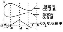 某生物興趣小組在密閉玻璃溫室內(nèi)進行植物栽培實驗,他們對溫室內(nèi)CO2含量.O2含量及CO2吸收速率進行了24 h測定,得到圖示曲線。以下說法中正確的有( )