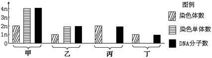 下圖中甲~丁為某動(dòng)物(染色體數(shù)=2n)睪丸中細(xì)胞分裂不同時(shí)期的染色體數(shù)、染色單體數(shù)和DNA分子數(shù)的比例圖,關(guān)于此圖敘述中錯(cuò)誤的是
