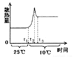 B.當環(huán)境溫度從25℃下降到10℃時,從時間t1到時間t2,散熱量增加是由于人體體溫與環(huán)境溫度的溫差加大造成的