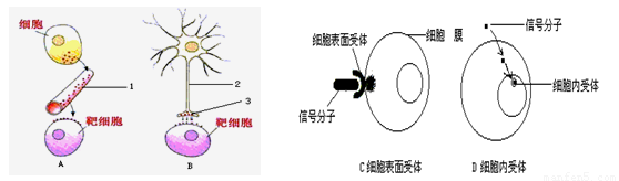 下圖A、B所示細(xì)胞通訊方式為人體內(nèi)常見的兩種方式,C、D表示不同的信號(hào)分子對(duì)靶細(xì)胞作用的方式。