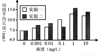 取相同長度、去除尖端的小麥胚芽鞘切段,分別用不同濃度的生長素溶液處理并培養(yǎng)一段時(shí)間后,逐一測(cè)量其長度,實(shí)驗(yàn)進(jìn)行兩次,結(jié)果如圖。以下敘述正確的是( )