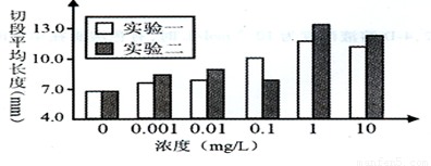 取相同長度、去除尖端的小麥胚芽鞘切段,分別用不同濃度的生長素溶液處理并培養(yǎng)一段時間后,逐一測量其長度,實驗進行兩次,結(jié)果如圖。以下敘述正確的