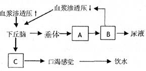 下圖為水平衡調(diào)節(jié)機(jī)理,請據(jù)圖判斷A、B、C依次是