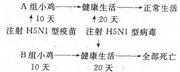 科學(xué)家初步研制出H5N1型禽流感疫苗,應(yīng)用前必須進(jìn)行動物實(shí)驗(yàn)檢測其效果,將未感染H5N1型病毒的一群健康小雞分為A、B兩組。實(shí)驗(yàn)過程和結(jié)果如下圖所示:下列相關(guān)分析錯(cuò)誤的是