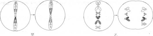 在細胞分裂過程中出現(xiàn)了甲、乙2種變異,甲圖中英文字母表示染色體片段。下列有關(guān)敘述正確的是