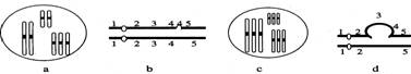 某些類型的染色體結(jié)構(gòu)和數(shù)目的變異,可通過對細(xì)胞有絲分裂中期或減數(shù)第一次分裂時(shí)期的觀察來識別。a、b、c、d為某些生物減數(shù)第一次分裂時(shí)期染色體變異的模式圖,它們依次屬于