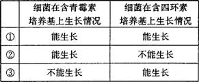 質(zhì)粒是基因工程中最常用的載體,它存在于許多細(xì)菌體內(nèi)。質(zhì)粒上有標(biāo)記基因如圖所示,通過(guò)標(biāo)記基因可以推知外源基因(目的基因)是否轉(zhuǎn)移成功。外源基因插入的位置不同,細(xì)菌在培養(yǎng)基上的生長(zhǎng)情況也不同,下表是外源基因插入位置(插入點(diǎn)有a.b.c),請(qǐng)根據(jù)表中提供的細(xì)菌生長(zhǎng)情況,推測(cè)①②③三種重組后細(xì)菌的外源基因插入點(diǎn),正確的一組是