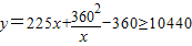 圍建一個面積為360 m2的矩形場地,要求矩形場地的一面利用舊墻(利用舊墻需維修),其它三面圍墻要新建,在舊墻的對面的新墻上要留一個寬度為2 m的進出口,如圖所示,已知舊墻的維修費用為45元/m,新墻的造價為180元/m,設(shè)利用的舊墻的長度為x(單位:米),修建此矩形場地圍墻的總費用為y(單位:元).![]()