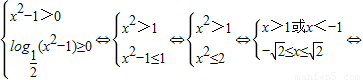 【答案】分析:由函數(shù)表達(dá)式知,被開方數(shù)大于或等于0,故對數(shù)的真數(shù)大于0且對數(shù)值小于或等于1,x2-1>0,且x2-1≤1;解可得答案.