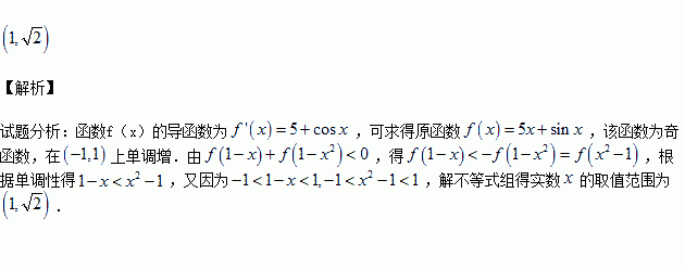 已知函數(shù)f(x)的導函數(shù)為f ′(x)=5+cosx,x∈(-1,1),且f(0)=0,如果f(1-x)+f(1-x2)<0,則實數(shù)x的取值范圍為________.
