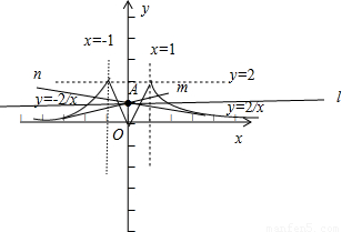 由于直線y=kx+1經(jīng)過定點A(0,1),當過A點的直線m與曲線y=-相切時,直線m與曲線y=|x+|-|x-|有四個公共點,