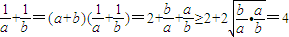 【答案】分析:由題設(shè)條件中的等比關(guān)系得出a+b=1,代入中,將其變?yōu)?+,利用基本不等式就可得出其最小值