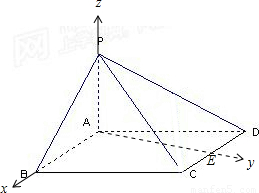 【答案】分析:取CD的中點(diǎn)E,連接AE,由底面是邊長為1的菱形,∠ABC=60°,PA⊥底面ABCD,PA=1,我們可以建立如圖所示的空間坐標(biāo)系,分別求出異面直線AB與PD的方向向量,代入向量夾角公式,即可求出異面直線AB與PD所成角的余弦值.