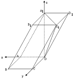 | 解:(1)∵ABCD是正方形, ∴AD⊥CD, 又A1D⊥平面ABCD,如圖,以D為原點建立空間直角體系 D-xyz, 在△ADA1中,由已知得A1D= ∴D(0,0,0),A1(0,0, C1(-1,1, B1(0,1, ∴ 設平面ABB1A1的法向量為m=(x1,y1,z1), ∴C1D ∴C1D∥平面ABB1A1; (2)設平面A1C1A的法向量為 由 又平面A1C1D的法向量為 設二面角D-A1C1-A的大小為α, ∴cosα= ∴二面角D-A1C1-A的余弦值為 |