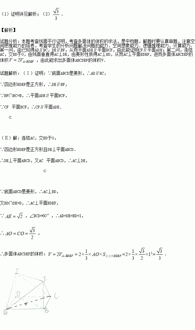 (12分)如圖,多面體ABCDEF中,底面ABCD是菱形,∠BCD=60°,四邊形BDEF是正方形且DE⊥平面ABCD.