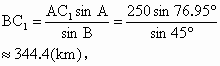 解:設(shè)臺(tái)風(fēng)中心從點(diǎn)B向西北方向沿射線BD移動(dòng),該市位于點(diǎn)B正西方向300km處的點(diǎn)A.假設(shè)經(jīng)過(guò)t h,臺(tái)風(fēng)中心到達(dá)點(diǎn)C,則在△ABC中,AB=300km,AC=250km,BC=40tkm,B=45°,由正弦定理,