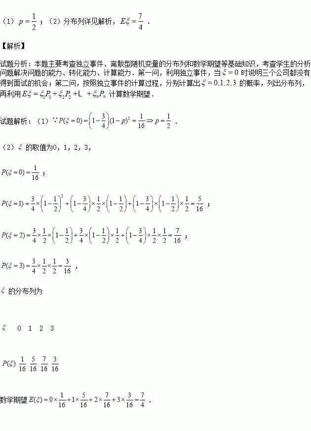 ,得到乙公司和丙公司面試的概率均為p,,且三個公司是否讓其面試是相互獨(dú)立的.記