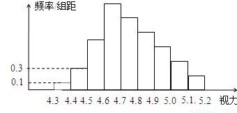 隨機(jī)抽查某中學(xué)高三年級(jí)100名學(xué)生的視力情況,得其頻率分布直方圖如下圖所示.已知前4組的頻數(shù)成等比數(shù)列,后6組的頻數(shù)成等差數(shù)列,則視力在4.6到5.0之間的學(xué)生人數(shù)為 人.
