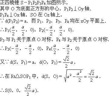 設(shè)正四棱錐S-P1P2P3P4的所有棱長均為a,建立適當(dāng)?shù)淖鴺?biāo)系,求點(diǎn)S、P1、P2、P3和P4的直角坐標(biāo).