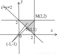 由題意與圖形可知,M到(-1,-1)的連線y=x與x+y=2的交點N(1,1)距離最小,