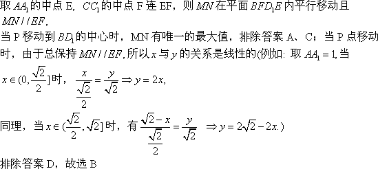 如圖,動(dòng)點(diǎn)P在正方體AC1的對(duì)角線BD1上,過點(diǎn)P作垂直于平面BB1D1D的直線,與正方體表面相交于M,N。設(shè)BP=x,MN=y,則
