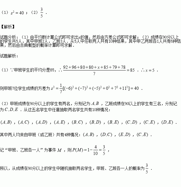 (2)從成績在90分以上的學(xué)生中隨機(jī)抽取兩名學(xué)生,求甲班、乙班各一人的概率.