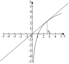方程只有一個(gè)解,可得:$\frac{k}{{x}_{0}}=1$,并且x0=klnx0,解得k=e,