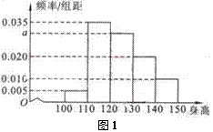 從某小學(xué)隨機(jī)抽取100名同學(xué),將他們身高(單位:厘米)數(shù)據(jù)繪制成頻率分布直方圖(如圖1)。由圖中數(shù)據(jù) 可知
