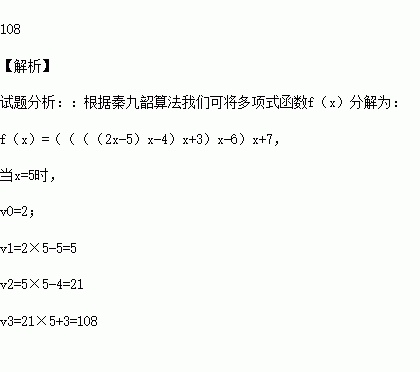 已知多項式函數(shù)f(x)=2x5-5x4-4x3+3x2-6x+7,當x=5時由秦九韶算法v0=2 v1=2×5-5=5