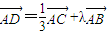 【答案】分析:取AC的一個三等分點E,滿足AE=AC,作DF平行于AE,則由條件可得四邊形AEDF為平行四邊形,求得∠AFD=120°,∠FAD=30°,∠FDA=30°,可得△AFD為等腰三角形,AF=DF=AC,故平行四邊形AEDF為菱形.利用余弦定理求得AD、BD、CD的值,再由三角形的內角平分線性質可得 ,由此求得λ的值,從而得到AD的值.