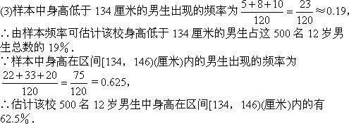 (3)估計(jì)身高低于134厘米的人數(shù)占總?cè)藬?shù)的百分比和身高在區(qū)間[134,146)(厘米)內(nèi)的人數(shù)占總?cè)藬?shù)的百分比.