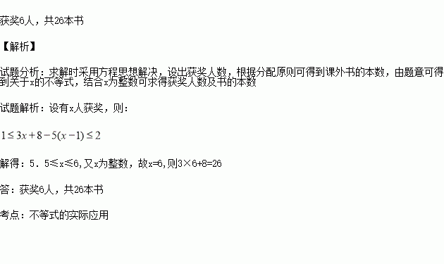 某校為了鼓勵(lì)在數(shù)學(xué)競(jìng)賽中獲獎(jiǎng)的學(xué)生,準(zhǔn)備買若干本課外讀物送給他們,如果每人送3本,則還剩8本;如果每人送5本,則最后一人得到的課外讀物不足3本,求該校的獲獎(jiǎng)人數(shù)及所買的課外讀物的本數(shù)?