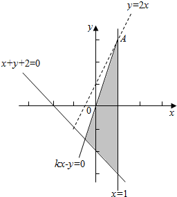 解:作出不等式組$\left\{\begin{array}{l}x≤1\\ x+y+2≥0\\ kx-y≥0\end{array}\right.$所對應(yīng)的平面區(qū)域(如圖陰影),