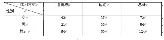 在對(duì)人們的休閑方式的一次調(diào)查中,共調(diào)查了124人,其中女性70人,男性54人。女性中有43人主要的休閑方式是看電視,另外27人主要的休閑方式是運(yùn)動(dòng);男性中有21人主要的休閑方式是看電視,另外33人主要的休閑方式是運(yùn)動(dòng)。