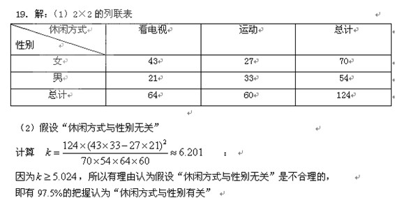 (12分) 在對(duì)人們的休閑方式的一次調(diào)查中,共調(diào)查了124人,其中女性70人,男性54人。女性中有43人主要的休閑方式是看電視,另外27人主要的休閑方式是運(yùn)動(dòng);男性中有21人主要的休閑方式是看電視,另外33人主要的休閑方式是運(yùn)動(dòng)。