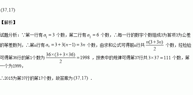 將正整數(shù)1,2,3,……,n,……,排成數(shù)表如圖所示,即第一行3個(gè)數(shù),第二行6個(gè)數(shù),且后一行比前一行多3個(gè)數(shù),若第i行、第j列的數(shù)可用(i,j)表示,則2015可表示為_______.
