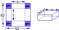 (本小題滿分12分)請你設(shè)計(jì)一個(gè)包裝盒,如下圖所示,ABCD是邊長為60cm的正方形硬紙片,切去陰影部分所示的四個(gè)全等的等腰直角三角形,再沿虛線折起,使得A、B、C、D四個(gè)點(diǎn)重合于圖中的點(diǎn)P,正好形成一個(gè)正四棱挪狀的包裝盒E、F在AB上,是被切去的一等腰直角三角形斜邊的兩個(gè)端點(diǎn).設(shè)AE= FB=x(cm).