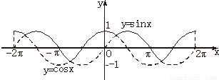 【答案】分析:f(x)的含義是取y=sinx和y=cosx的較大者,所以先在同一坐標(biāo)系內(nèi)畫出y=sinx和y=cosx的圖象,然后取上方的部分,就得到f(x)的圖象.畫出圖象來之后,就很容易的找出單調(diào)區(qū)間,最大最小值,同時(shí)也容易看出周期來.