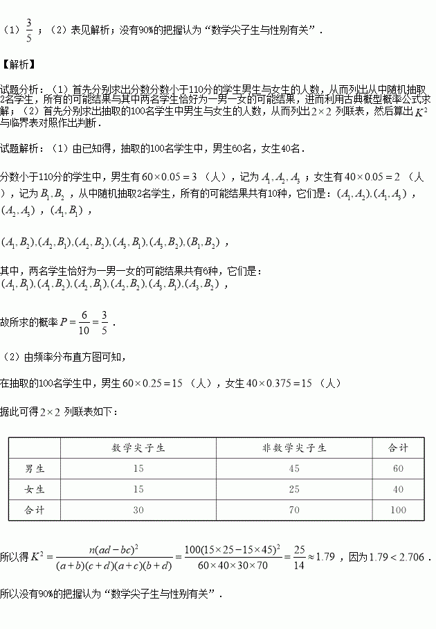 (1)從樣本中分?jǐn)?shù)小于110分的學(xué)生中隨機(jī)抽取2人,求兩人恰好為一男一女的概率;